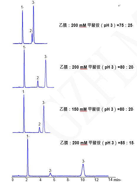 乙腈與緩沖鹽的比例,緩沖鹽的濃度可調(diào)整保留時(shí)間。