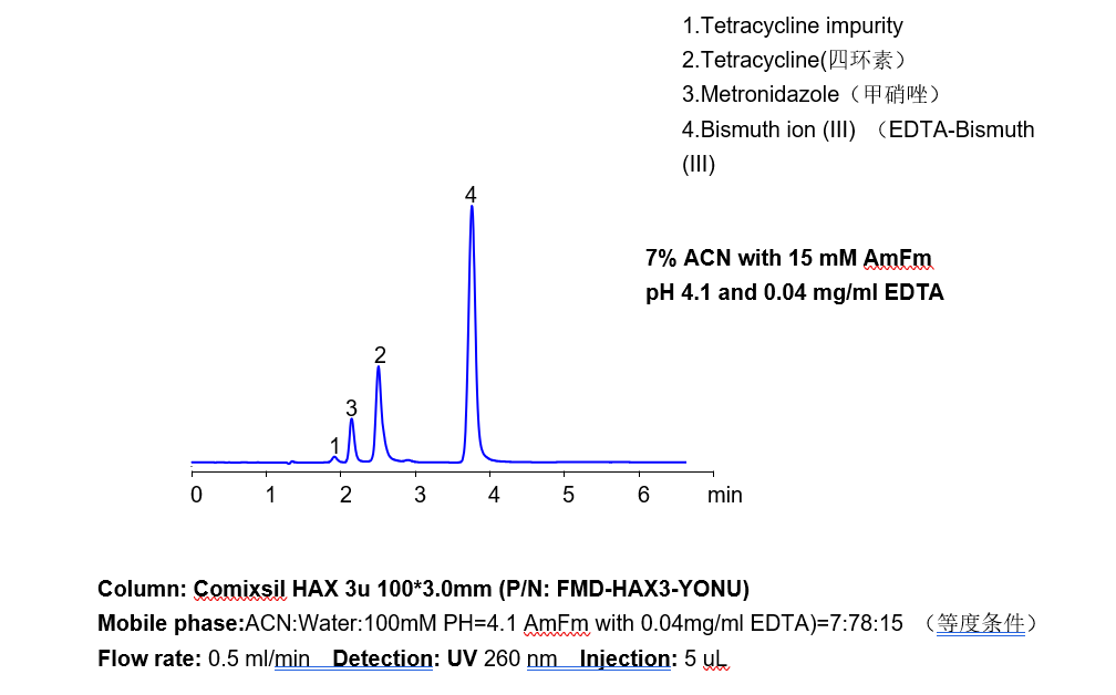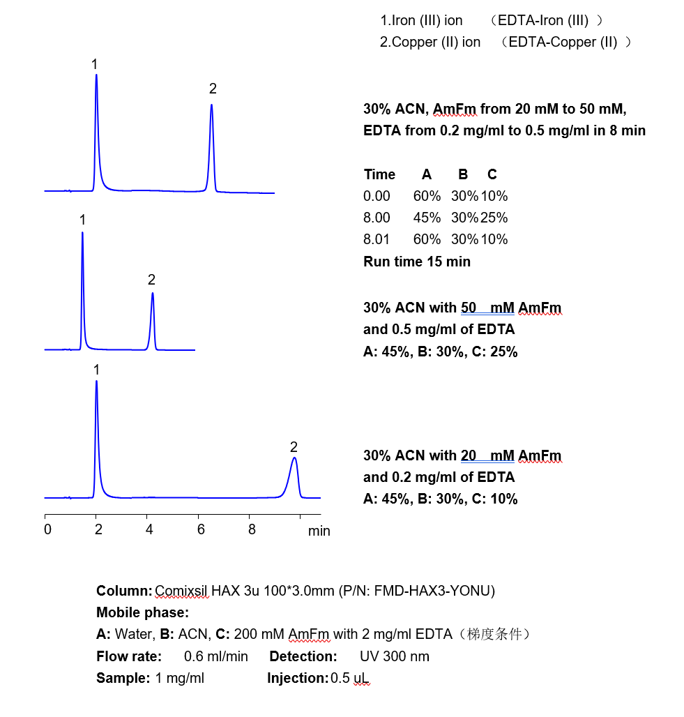 總結(jié): 綜上,方法A,B,C的關(guān)于三價(jià)鐵離子(二價(jià)鐵離子)與三價(jià)鉍離子,在藥物制劑,保健品,藥物殘留中的應(yīng)用。我們可以了解到,采用流動相中加EDTA,或者樣品配置時(shí)加EDTA(可避免流動相中加EDTA),使三價(jià)金屬離子與EDTA絡(luò)合合,基于Comixsil HAX智能混合柱對此絡(luò)合物的保留,UV的可視化,可以用簡單的HPLC+UV的方法來檢測定三價(jià)離子(以上方法C中,客戶實(shí)際上也自行開發(fā)了樣品配置時(shí)加EDTA的方法)。同時(shí),方法的實(shí)際優(yōu)化過程中,EDTA的濃度與甲酸銨的濃度,會影響金屬離子絡(luò)合物的保留,峰形以及UV響應(yīng)值。這些因素是需要根據(jù)不同實(shí)際樣品而進(jìn)行調(diào)整的。 小知識點(diǎn):用過EDTA系統(tǒng)的清洗 在HPLC方法中,EDTA是能不使用則不使用的,然后它的特殊性,在一些傳統(tǒng)的老品種,老藥典方法中仍然存在。有很多關(guān)于用過EDTA的儀器,管路,如何清洗的問題。在此分享如下: 1.要使用EDTA時(shí),管路盡可能用PEEK管; 2.懷疑或擔(dān)心EDTA殘留,要清洗儀器與金屬管路時(shí),可以用100%的50mM CuSO4水溶液先沖洗管路1小時(shí),再用0.2%-0.3%的硫酸水溶液清洗30分鐘,最后再用水清洗10分鐘左右即可。