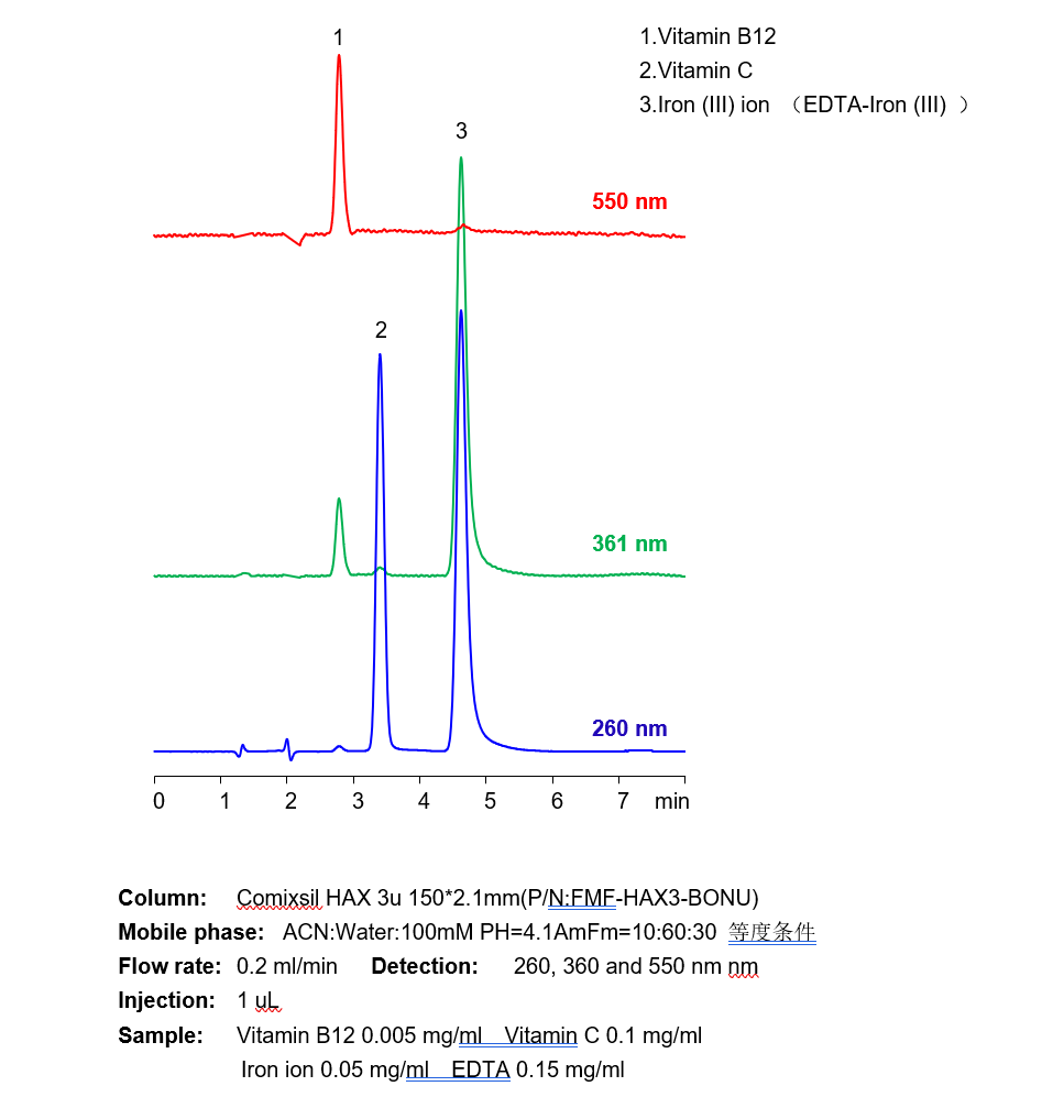 三價(jià)鐵離子等三價(jià)金屬離子,在硅膠基質(zhì)的色譜柱中極易死吸附,從而損壞色譜柱,在液相直接檢測中存在較大難度。 本方法研究三價(jià)鐵離子與EDTA形成紫外可見的強(qiáng)吸收絡(luò)合物,再通過Comixsil HAX色譜柱保留。通過對絡(luò)合物的定量從而定量三價(jià)鐵離子等三價(jià)金屬離子。 應(yīng)用一:三價(jià)鐵離子的檢測 方法A、三價(jià)鐵離子流動相中與EDTA絡(luò)合
