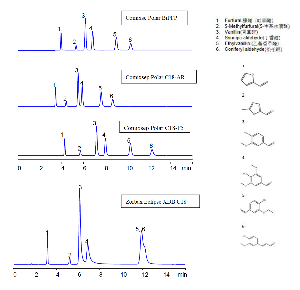 Comixsep 分析六種結(jié)構(gòu)相似醛的選擇性對比 App ID: FLM-220031 色譜柱:Comixsep Polar C18-AR, C18-F5, BiPFP(規(guī)格4.6*150 mm, 3 um) 方法: 水:乙腈:200mM 磷酸二氫銨:1%磷酸=45:20:25:10 流速:1 mL/min 檢測波長:225nm ![]() |