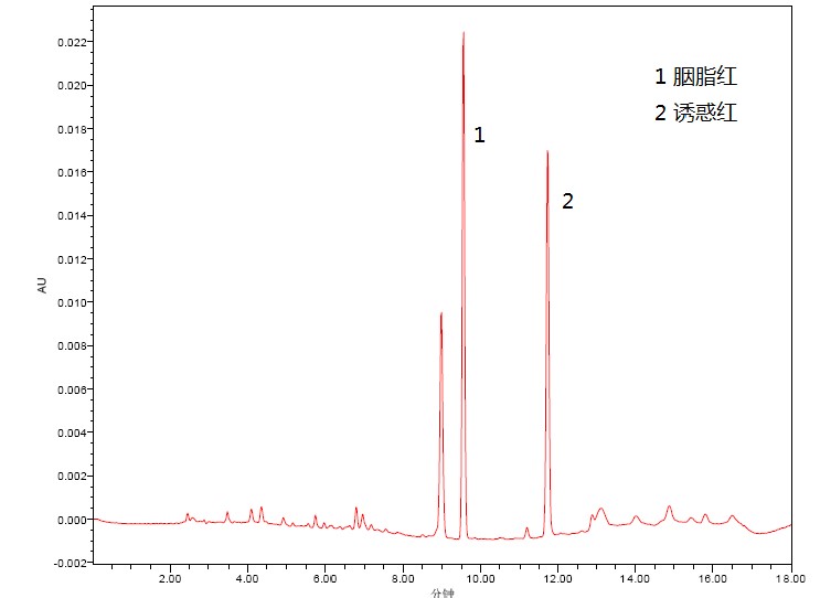 2、添加水平為 0.2 mg/kg 火腿中胭脂紅和誘惑紅檢測的液相色譜圖