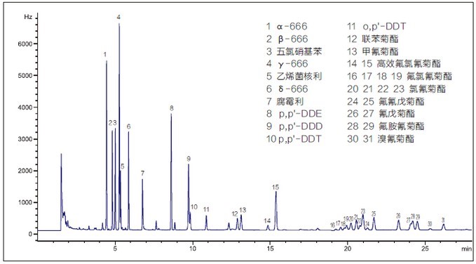 2、黃瓜中農(nóng)藥多殘留檢測(cè)色譜圖