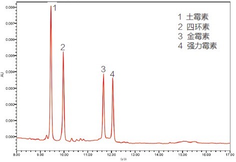 圖1 添加水平為0.8mg/kg牛奶基質中四環(huán)素檢測色譜圖
